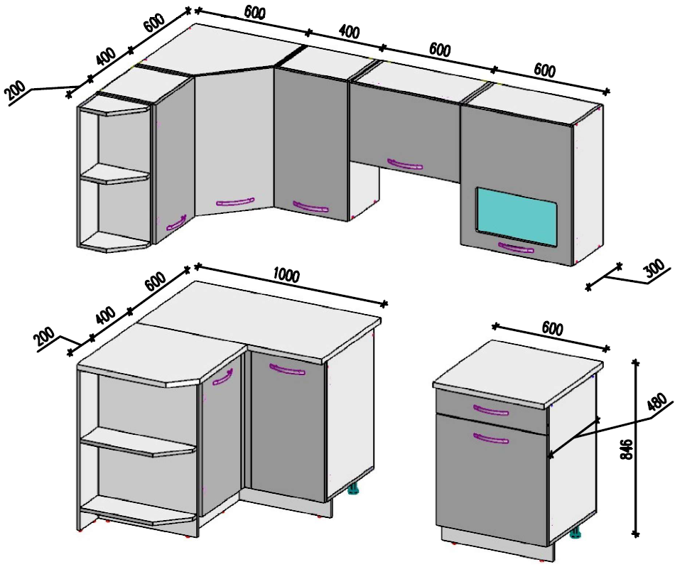Высота нижних шкафов: 84.6 см (со столешницей)