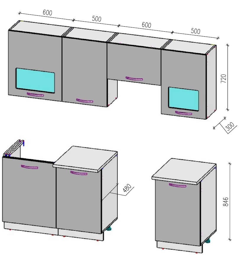 Высота нижних шкафов: 84.6 см (со столешницей)