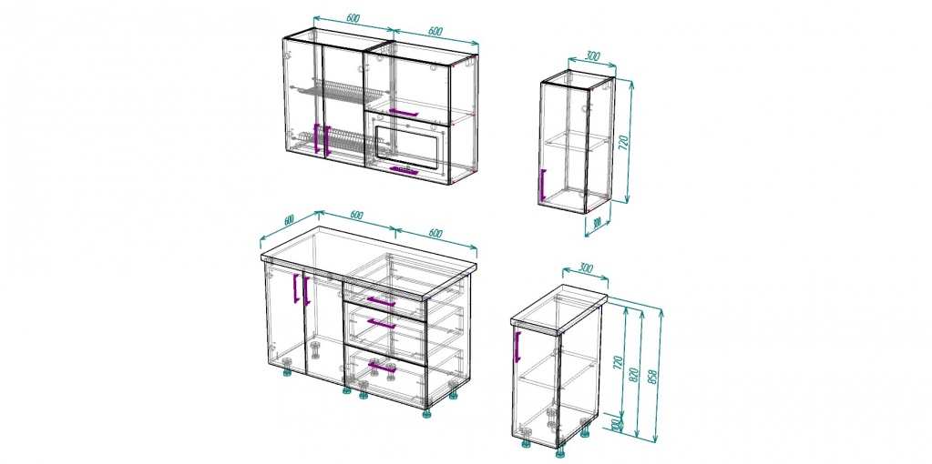 Характеристики Высота верхних шкафов: 72 см Глубина верхних шкафов: 30см (с фасадом 31,8см) Высота нижних шкафов: 85.8 см (со столешницей) Глубина нижних шкафов: 60 см (по столешнице) Ширина шкафа под мойку: 60 см