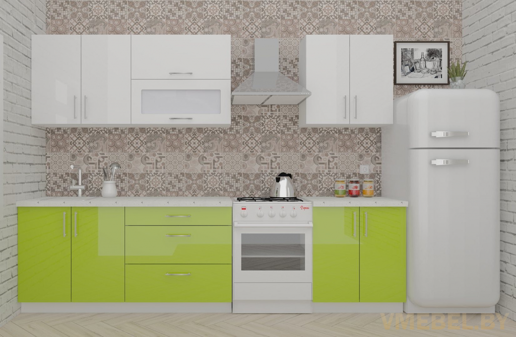 Основные Длина кухни: 230 см Конструкция кухни: линейная Материал каркаса: ЛДСП Эггер Белый базовый 18мм W908 SM Тип фасада: прямой Материал верхних фасадов: Постформинг (пластик) белый Материал нижних фасадов: Постформинг (пластик) лайм яркий Столешница: отдельная на каждый шкаф либо цельная на каждый участок Материал столешницы: Plattan (38 мм) Мрамор марквина белый 3028 (влагозащитная ДСП EGGER с каплеуловителем) Выдвижные ящики: 3 шт. Направляющие: шариковые направляющие полного выдвижения с доводчиками GTV Versalite Петли: Петля накладная с доводчиком GTV PRESTIGE Навесы: Крепление верхних ящиков к стене на регулируемые навесы на монтажную планку, монтажная планка в комплекте Крепление петель к боковине: на евровинтах Конструкция задней стенки: премиум (задняя стенка ящиков вставляется в фрезеруемый в паз) Цоколь: пластиковый белый H-100 Сушка: белая стандарт Ручка: Ручка UA-337 160 мм алюминий