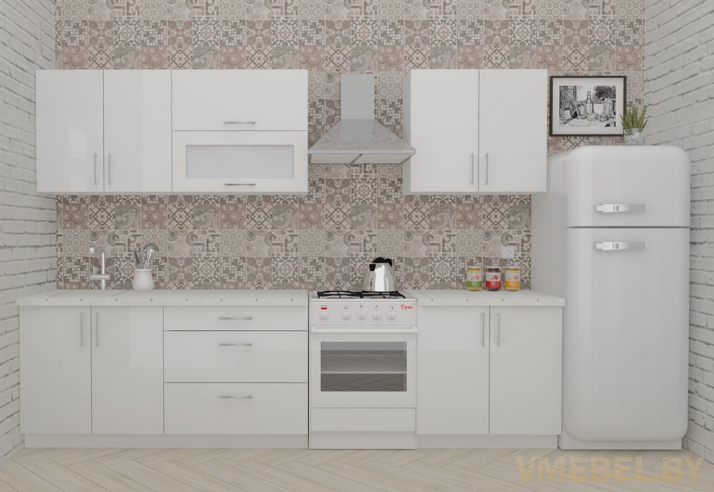 Основные Длина кухни: 240 см Конструкция кухни: линейная Материал каркаса: ЛДСП Эггер Белый базовый 18мм W908 SM Тип фасада: прямой Материал верхних фасадов: Постформинг (пластик) белый Материал нижних фасадов: Постформинг (пластик) белый Столешница: отдельная на каждый шкаф либо цельная на каждый участок Материал столешницы: Plattan (38 мм) Мрамор марквина белый 3028 (влагозащитная ДСП EGGER с каплеуловителем) Выдвижные ящики: 3 шт. Направляющие: шариковые направляющие полного выдвижения с доводчиками GTV Versalite Петли: Петля накладная с доводчиком GTV PRESTIGE Навесы: Крепление верхних ящиков к стене на регулируемые навесы на монтажную планку, монтажная планка в комплекте Крепление петель к боковине: на евровинтах Конструкция задней стенки: премиум (задняя стенка ящиков вставляется в фрезеруемый в паз) Цоколь: пластиковый белый H-100 Сушка: белая стандарт Ручка: Ручка UA-337 160 мм алюминий