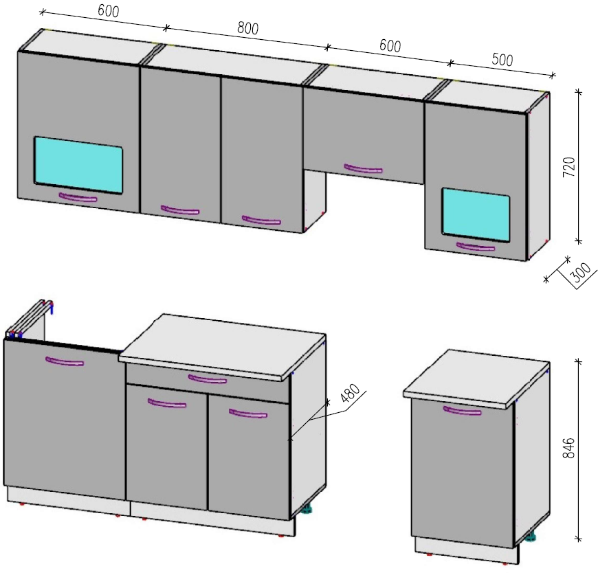 Высота нижних шкафов: 84.6 см (со столешницей)