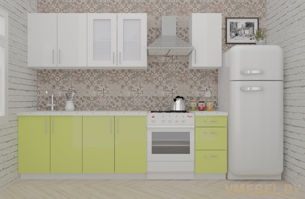 Основные Длина кухни: 200 см Конструкция кухни: линейная Материал каркаса: ЛДСП Эггер Белый базовый 18мм W908 SM Тип фасада: прямой Материал верхних фасадов: Постформинг (пластик) белый Материал нижних фасадов: Постформинг (пластик) лайм Столешница: отдельная на каждый шкаф либо цельная на каждый участок Материал столешницы: Plattan (38 мм) Мрамор марквина белый 3028 (влагозащитная ДСП EGGER с каплеуловителем) Выдвижные ящики: 3 шт. Направляющие: шариковые направляющие полного выдвижения с доводчиками GTV Versalite Петли: Петля накладная с доводчиком GTV PRESTIGE Навесы: Крепление верхних ящиков к стене на регулируемые навесы на монтажную планку, монтажная планка в комплекте Крепление петель к боковине: на евровинтах Конструкция задней стенки: премиум (задняя стенка ящиков вставляется в фрезеруемый в паз) Цоколь: пластиковый белый H-100 Сушка: белая стандарт Ручка: Ручка UA-337 160 мм алюминий