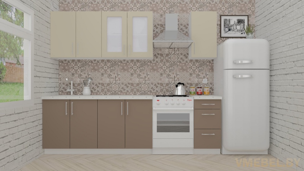 Основные Длина кухни: 200 см Конструкция кухни: линейная Материал каркаса: ЛДСП Эггер Белый базовый 18мм W908 SM Тип фасада: прямой Материал верхних фасадов: ЛДСП бежевый Материал нижних фасадов: ЛДСП латте Столешница: отдельная на каждый шкаф либо цельная на каждый участок Материал столешницы: Plattan (38 мм) Мрамор марквина белый 3028 (влагозащитная ДСП EGGER с каплеуловителем) Выдвижные ящики: 3 шт. Направляющие: шариковые направляющие полного выдвижения с доводчиками GTV Versalite Петли: Петля накладная с доводчиком GTV PRESTIGE Навесы: Крепление верхних ящиков к стене на регулируемые навесы на монтажную планку, монтажная планка в комплекте Крепление петель к боковине: на евровинтах Конструкция задней стенки: премиум (задняя стенка ящиков вставляется в фрезеруемый в паз) Цоколь: пластиковый белый H-100 Сушка: белая стандарт Ручка: Ручка UA-337 160 мм алюминий