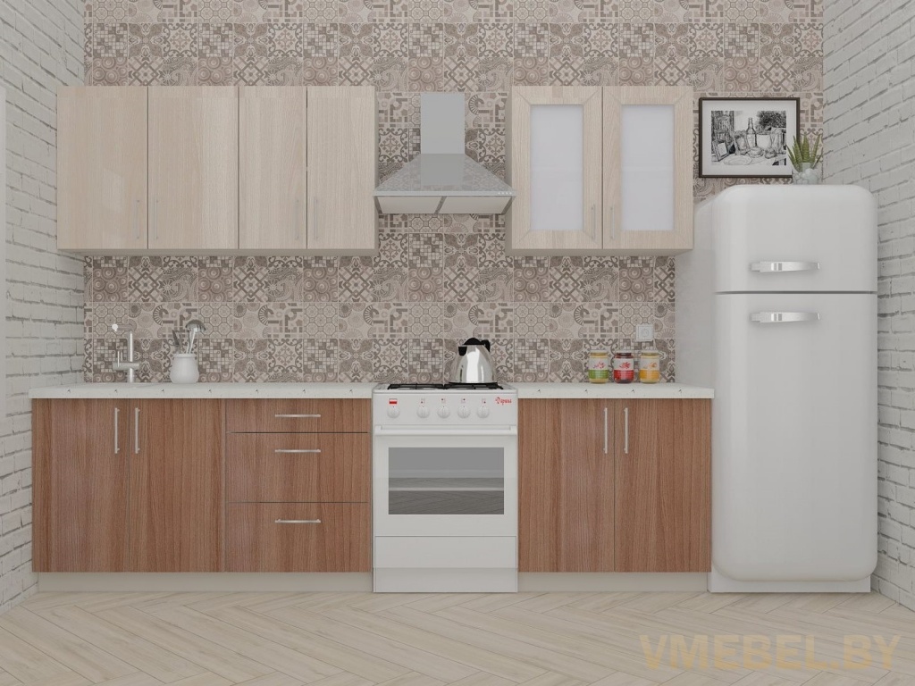 Основные Длина кухни: 220 см Конструкция кухни: линейная Материал каркаса: ЛДСП Эггер Белый базовый 18мм W908 SM Тип фасада: прямой Материал верхних фасадов: ЛДСП ясень шимо светлый Материал нижних фасадов: ЛДСП ясень шимо темный Столешница: отдельная на каждый шкаф либо цельная на каждый участок Материал столешницы: Plattan (38 мм) Мрамор марквина белый 3028 (влагозащитная ДСП EGGER с каплеуловителем) Выдвижные ящики: 3 шт. Направляющие: шариковые направляющие полного выдвижения с доводчиками GTV Versalite Петли: Петля накладная с доводчиком GTV PRESTIGE Навесы: Крепление верхних ящиков к стене на регулируемые навесы на монтажную планку, монтажная планка в комплекте Крепление петель к боковине: на евровинтах Конструкция задней стенки: премиум (задняя стенка ящиков вставляется в фрезеруемый в паз) Цоколь: пластиковый белый H-100 Сушка: белая стандарт Ручка: Ручка UA-337 160 мм алюминий