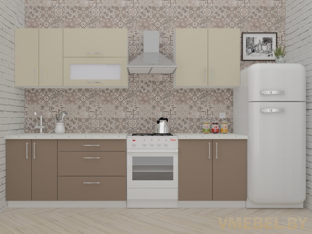 Основные Длина кухни: 220 см Конструкция кухни: линейная Материал каркаса: ЛДСП Эггер Белый базовый 18мм W908 SM Тип фасада: прямой Материал верхних фасадов: ЛДСП бежевый Материал нижних фасадов: ЛДСП латте Столешница: отдельная на каждый шкаф либо цельная на каждый участок Материал столешницы: Plattan (38 мм) Мрамор марквина белый 3028 (влагозащитная ДСП EGGER с каплеуловителем) Выдвижные ящики: 3 шт. Направляющие: шариковые направляющие полного выдвижения с доводчиками GTV Versalite Петли: Петля накладная с доводчиком GTV PRESTIGE Навесы: Крепление верхних ящиков к стене на регулируемые навесы на монтажную планку, монтажная планка в комплекте Крепление петель к боковине: на евровинтах Конструкция задней стенки: премиум (задняя стенка ящиков вставляется в фрезеруемый в паз) Цоколь: пластиковый белый H-100 Сушка: белая стандарт Ручка: Ручка UA-337 160 мм алюминий