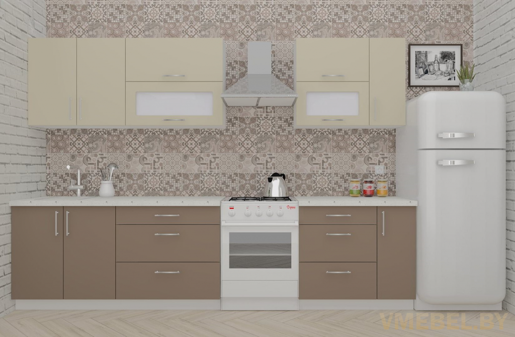 Основные Длина кухни: 250 см Конструкция кухни: линейная Материал каркаса: ЛДСП Эггер Белый базовый 18мм W908 SM Тип фасада: прямой Материал верхних фасадов: ЛДСП бежевый Материал нижних фасадов: ЛДСП латте Столешница: отдельная на каждый шкаф либо цельная на каждый участок Материал столешницы: Plattan (38 мм) Мрамор марквина белый 3028 (влагозащитная ДСП EGGER с каплеуловителем) Выдвижные ящики: 3 шт. Направляющие: шариковые направляющие полного выдвижения с доводчиками GTV Versalite Петли: Петля накладная с доводчиком GTV PRESTIGE Навесы: Крепление верхних ящиков к стене на регулируемые навесы на монтажную планку, монтажная планка в комплекте Крепление петель к боковине: на евровинтах Конструкция задней стенки: премиум (задняя стенка ящиков вставляется в фрезеруемый в паз) Цоколь: пластиковый белый H-100 Сушка: белая стандарт Ручка: Ручка UA-337 160 мм алюминий