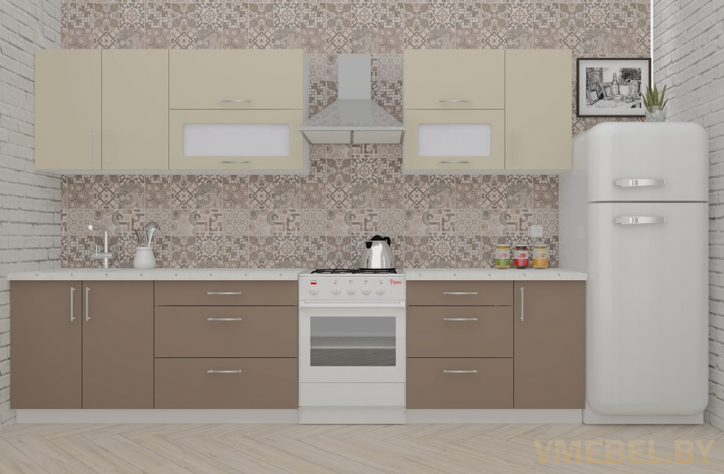 Основные Длина кухни: 260 см Конструкция кухни: линейная Материал каркаса: ЛДСП Эггер Белый базовый 18мм W908 SM Тип фасада: прямой Материал верхних фасадов: ЛДСП бежевый Материал нижних фасадов: ЛДСП латте Столешница: отдельная на каждый шкаф либо цельная на каждый участок Материал столешницы: Plattan (38 мм) Мрамор марквина белый 3028 (влагозащитная ДСП EGGER с каплеуловителем) Выдвижные ящики: 3 шт. Направляющие: шариковые направляющие полного выдвижения с доводчиками GTV Versalite Петли: Петля накладная с доводчиком GTV PRESTIGE Навесы: Крепление верхних ящиков к стене на регулируемые навесы на монтажную планку, монтажная планка в комплекте Крепление петель к боковине: на евровинтах Конструкция задней стенки: премиум (задняя стенка ящиков вставляется в фрезеруемый в паз) Цоколь: пластиковый белый H-100 Сушка: белая стандарт Ручка: Ручка UA-337 160 мм алюминий