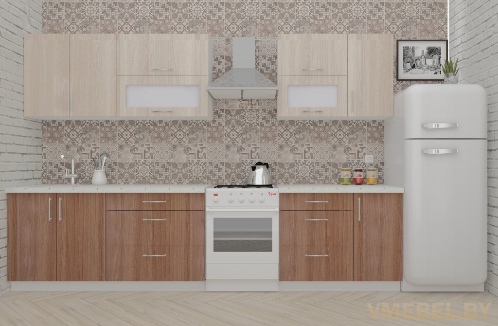 Основные Длина кухни: 260 см Конструкция кухни: линейная Материал каркаса: ЛДСП Эггер Белый базовый 18мм W908 SM Тип фасада: прямой Материал верхних фасадов: ЛДСП ясень шимо светлый Материал нижних фасадов: ЛДСП ясень шимо темный Столешница: отдельная на каждый шкаф либо цельная на каждый участок Материал столешницы: Plattan (38 мм) Мрамор марквина белый 3028 (влагозащитная ДСП EGGER с каплеуловителем) Выдвижные ящики: 3 шт. Направляющие: шариковые направляющие полного выдвижения с доводчиками GTV Versalite Петли: Петля накладная с доводчиком GTV PRESTIGE Навесы: Крепление верхних ящиков к стене на регулируемые навесы на монтажную планку, монтажная планка в комплекте Крепление петель к боковине: на евровинтах Конструкция задней стенки: премиум (задняя стенка ящиков вставляется в фрезеруемый в паз) Цоколь: пластиковый белый H-100 Сушка: белая стандарт Ручка: Ручка UA-337 160 мм алюминий