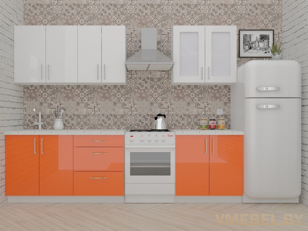 Основные Длина кухни: 220 см Конструкция кухни: линейная Материал каркаса: ЛДСП Эггер Белый базовый 18мм W908 SM Тип фасада: прямой Материал верхних фасадов: Постформинг (пластик) белый Материал нижних фасадов: Постформинг (пластик) яркий оранжевый Столешница: отдельная на каждый шкаф либо цельная на каждый участок Материал столешницы: Plattan (38 мм) Мрамор марквина белый 3028 (влагозащитная ДСП EGGER с каплеуловителем) Выдвижные ящики: 3 шт. Направляющие: шариковые направляющие полного выдвижения с доводчиками GTV Versalite Петли: Петля накладная с доводчиком GTV PRESTIGE Навесы: Крепление верхних ящиков к стене на регулируемые навесы на монтажную планку, монтажная планка в комплекте Крепление петель к боковине: на евровинтах Конструкция задней стенки: премиум (задняя стенка ящиков вставляется в фрезеруемый в паз) Цоколь: пластиковый белый H-100 Сушка: белая стандарт Ручка: Ручка UA-337 160 мм алюминий