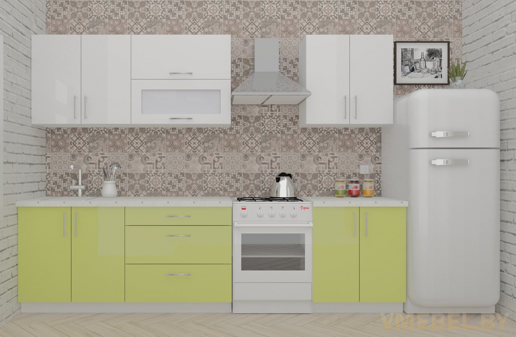 Основные Длина кухни: 230 см Конструкция кухни: линейная Материал каркаса: ЛДСП Эггер Белый базовый 18мм W908 SM Тип фасада: прямой Материал верхних фасадов: Постформинг (пластик) белый Материал нижних фасадов: Постформинг (пластик) лайм Столешница: отдельная на каждый шкаф либо цельная на каждый участок Материал столешницы: Plattan (38 мм) Мрамор марквина белый 3028 (влагозащитная ДСП EGGER с каплеуловителем) Выдвижные ящики: 3 шт. Направляющие: шариковые направляющие полного выдвижения с доводчиками GTV Versalite Петли: Петля накладная с доводчиком GTV PRESTIGE Навесы: Крепление верхних ящиков к стене на регулируемые навесы на монтажную планку, монтажная планка в комплекте Крепление петель к боковине: на евровинтах Конструкция задней стенки: премиум (задняя стенка ящиков вставляется в фрезеруемый в паз) Цоколь: пластиковый белый H-100 Сушка: белая стандарт Ручка: Ручка UA-337 160 мм алюминий