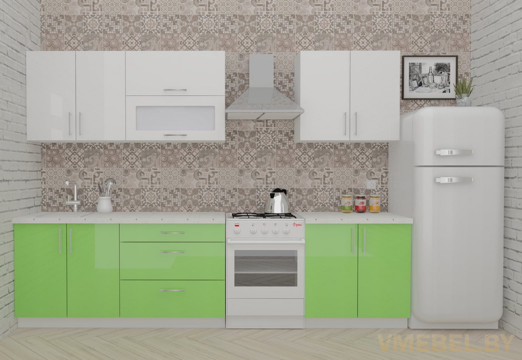 Основные Длина кухни: 240 см Конструкция кухни: линейная Материал каркаса: ЛДСП Эггер Белый базовый 18мм W908 SM Тип фасада: прямой Материал верхних фасадов: Постформинг (пластик) белый Материал нижних фасадов: Постформинг (пластик) яблоко Столешница: отдельная на каждый шкаф либо цельная на каждый участок Материал столешницы: Plattan (38 мм) Мрамор марквина белый 3028 (влагозащитная ДСП EGGER с каплеуловителем) Выдвижные ящики: 3 шт. Направляющие: шариковые направляющие полного выдвижения с доводчиками GTV Versalite Петли: Петля накладная с доводчиком GTV PRESTIGE Навесы: Крепление верхних ящиков к стене на регулируемые навесы на монтажную планку, монтажная планка в комплекте Крепление петель к боковине: на евровинтах Конструкция задней стенки: премиум (задняя стенка ящиков вставляется в фрезеруемый в паз) Цоколь: пластиковый белый H-100 Сушка: белая стандарт Ручка: Ручка UA-337 160 мм алюминий