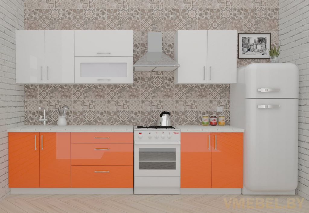 Основные Длина кухни: 240 см Конструкция кухни: линейная Материал каркаса: ЛДСП Эггер Белый базовый 18мм W908 SM Тип фасада: прямой Материал верхних фасадов: Постформинг (пластик) белый Материал нижних фасадов: Постформинг (пластик) яркий оранжевый Столешница: отдельная на каждый шкаф либо цельная на каждый участок Материал столешницы: Plattan (38 мм) Мрамор марквина белый 3028 (влагозащитная ДСП EGGER с каплеуловителем) Выдвижные ящики: 3 шт. Направляющие: шариковые направляющие полного выдвижения с доводчиками GTV Versalite Петли: Петля накладная с доводчиком GTV PRESTIGE Навесы: Крепление верхних ящиков к стене на регулируемые навесы на монтажную планку, монтажная планка в комплекте Крепление петель к боковине: на евровинтах Конструкция задней стенки: премиум (задняя стенка ящиков вставляется в фрезеруемый в паз) Цоколь: пластиковый белый H-100 Сушка: белая стандарт Ручка: Ручка UA-337 160 мм алюминий