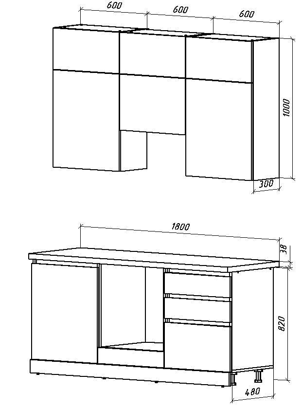 Глубина нижних шкафов: 60 см (48 см глубина по корпусу)