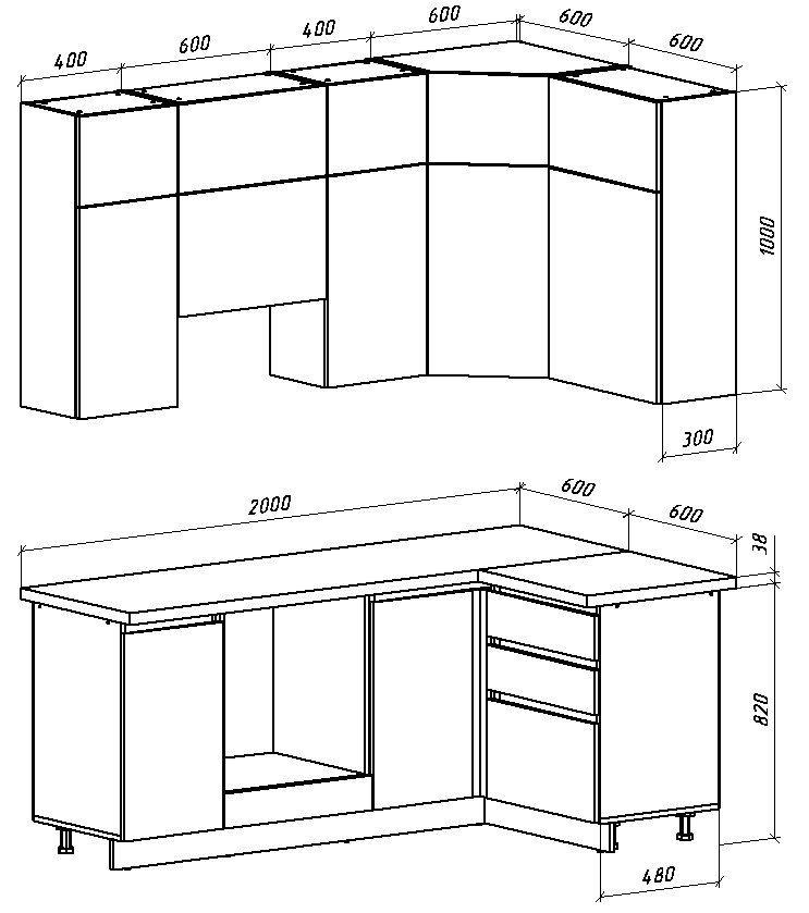 Глубина нижних шкафов: 60 см (48 см глубина по корпусу)